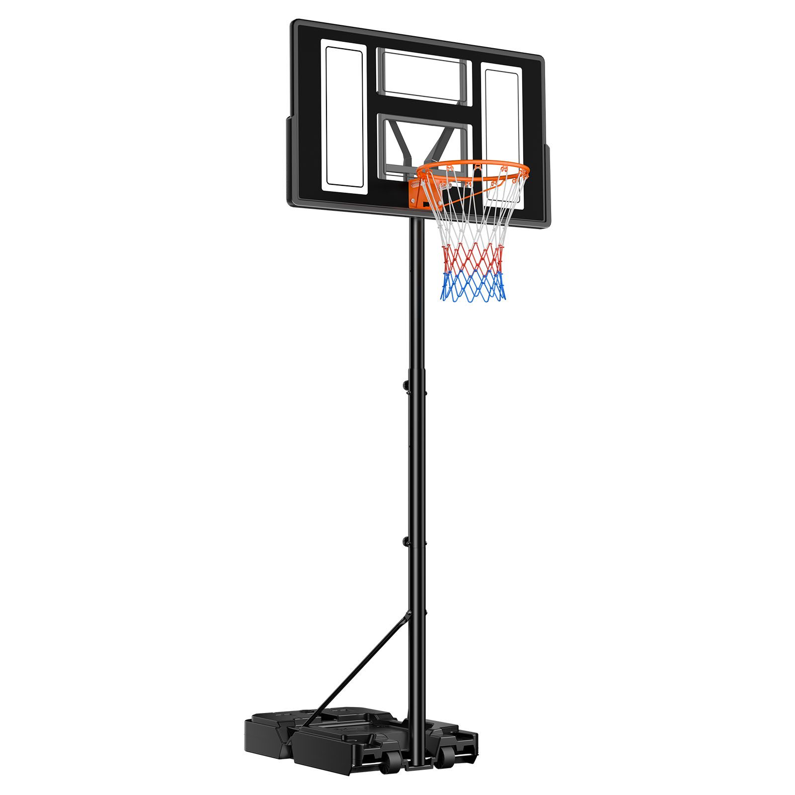 This portable basketball stand brings pro-level play home. Reinforced steel and PC backboard handle every impact. Clear backboard boosts shot accuracy, and the durable net stands up to all weather. Includes sandbag for extra stability. Designed for kids, teens, and adults.